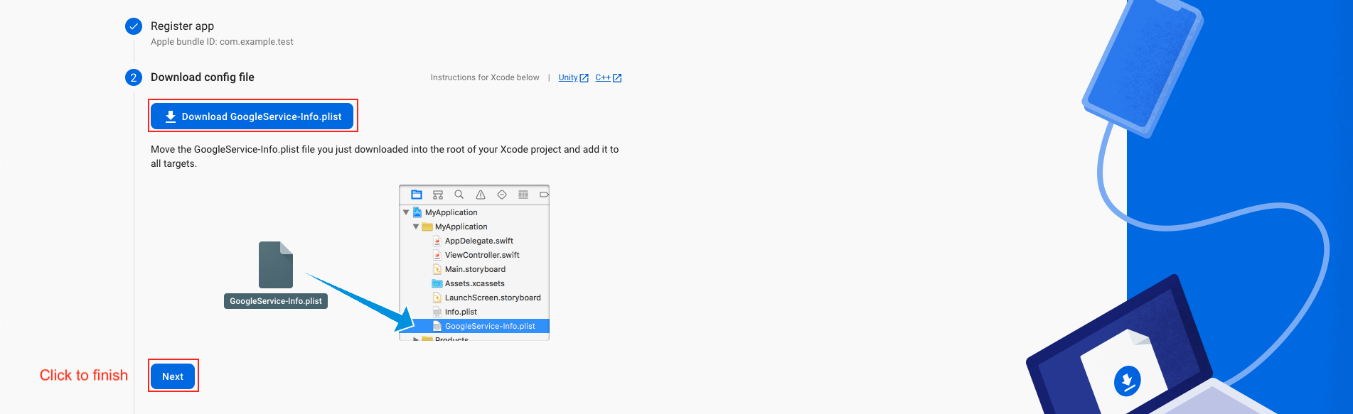 - Back in the Firebase console-setup workflow, click Next to skip the remaining steps and then finish and complete