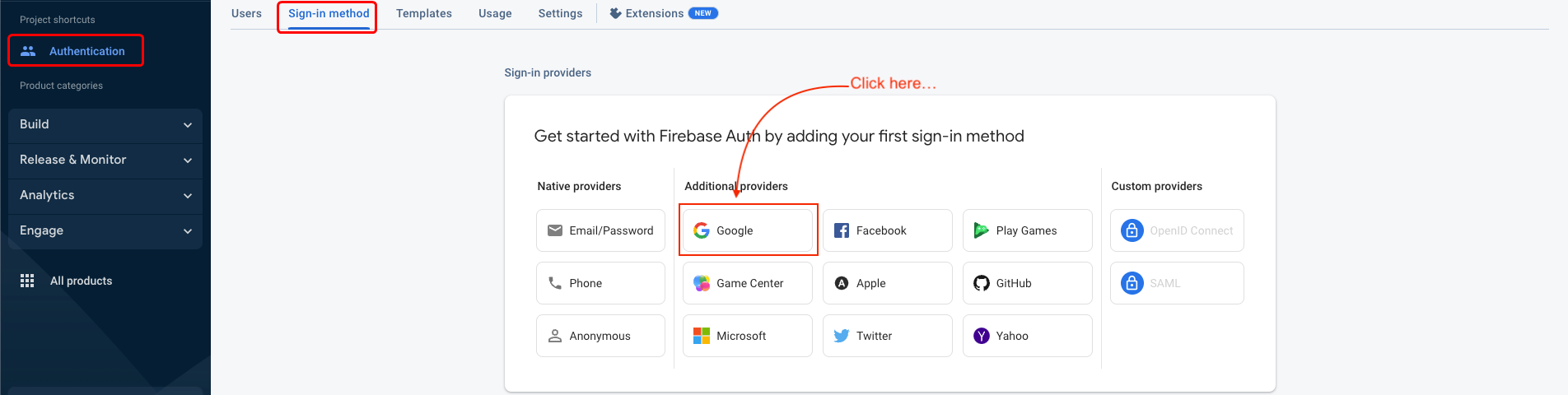 - Navigate to the "Authentication" section and select the "Sign-in method" tab.