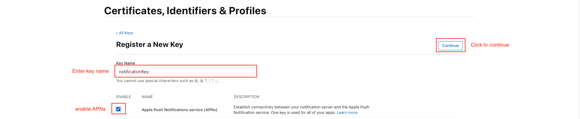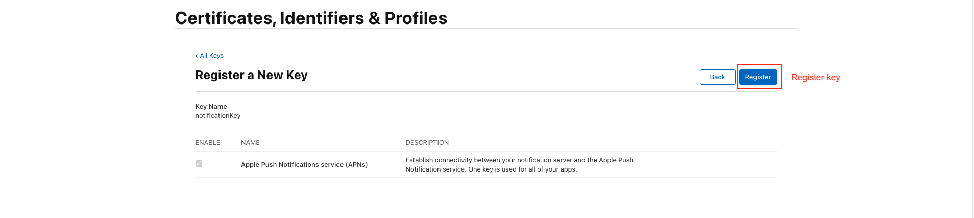 - A key can be generated which gives the FCM full access over the Apple Push Notification service (APNs). On the "Keys" menu item, register a new key. The name of the key can be anything, however you must ensure the APNs service is enabled.