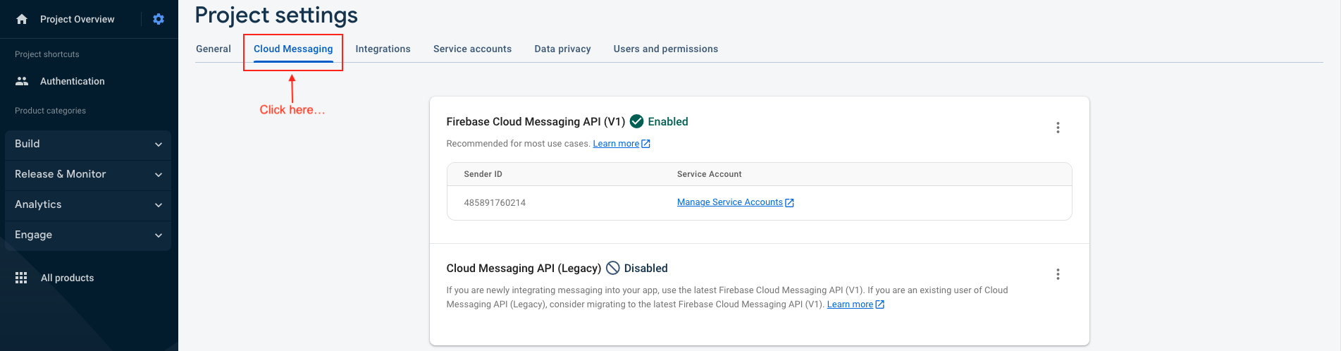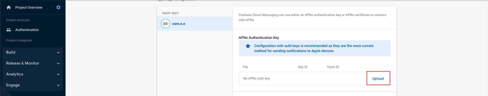 - The file & Key ID can now be added to your Firebase Project. On the Firebase Console, navigate to the "Project settings" and select the "Cloud Messaging" tab. Select your iOS application under the "iOS app configuration" heading.s