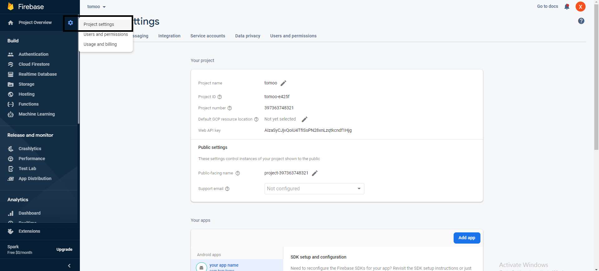 - Click on the gear icon (Settings) next to "Project Overview" on the top left corner of the Firebase Console.