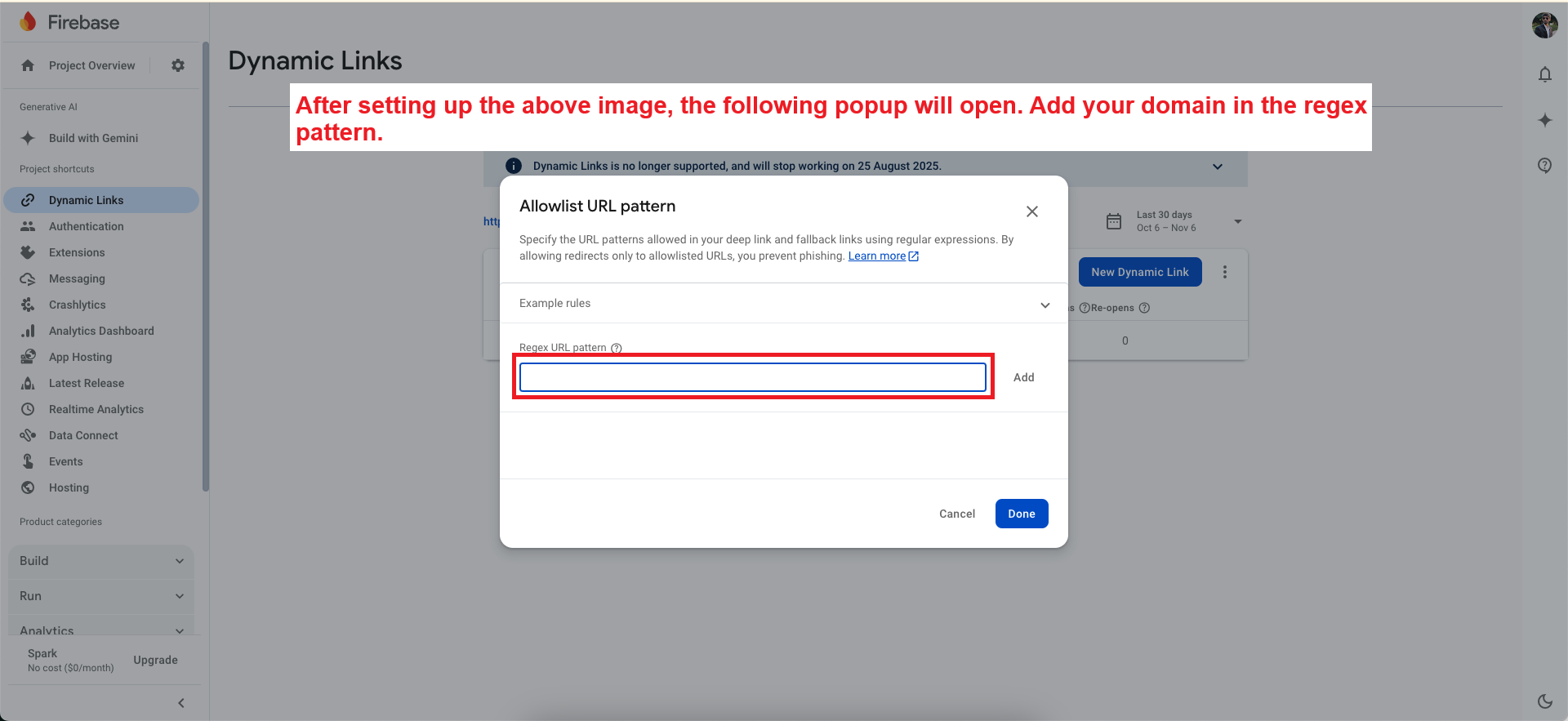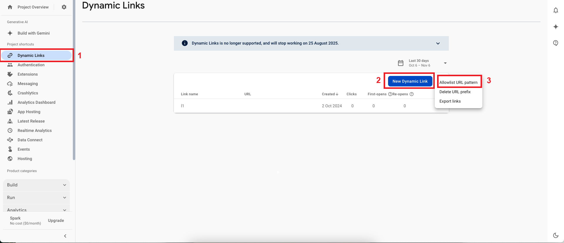 - Navigate to the "Dynamic Links" section and click the three dots.