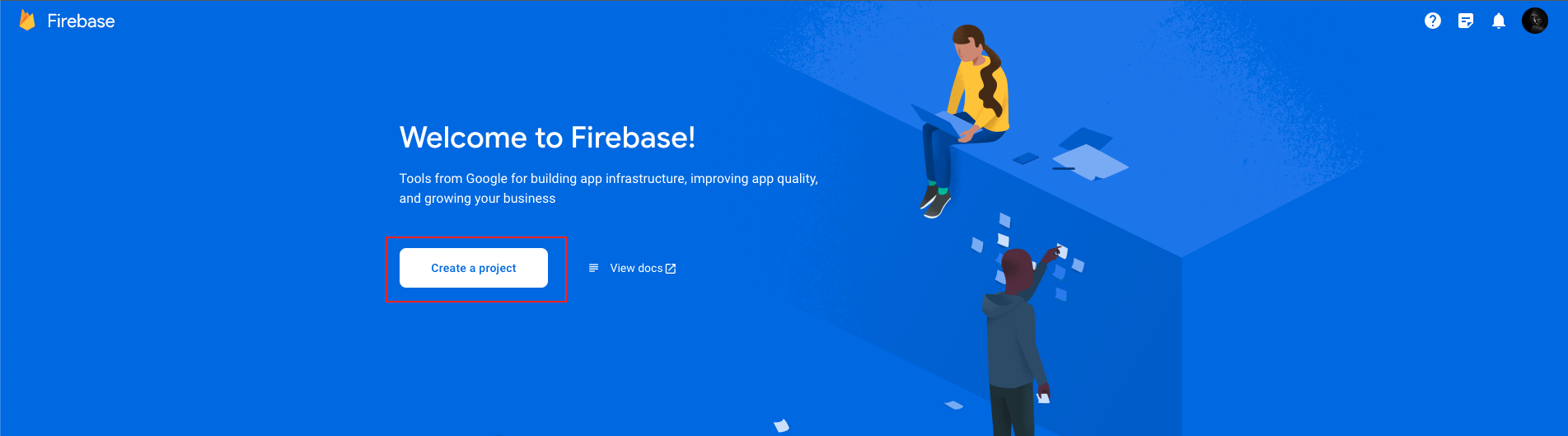 - Upon successful login, you will be directed to the Firebase Console. Click on the "Add project" button to initiate the creation of a new project.