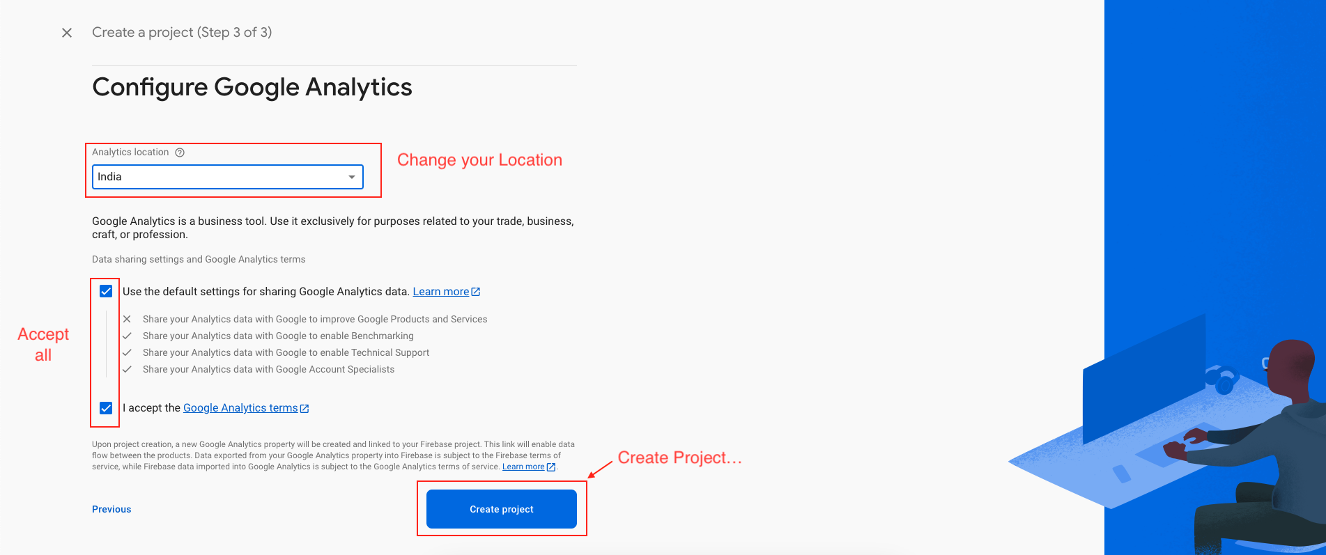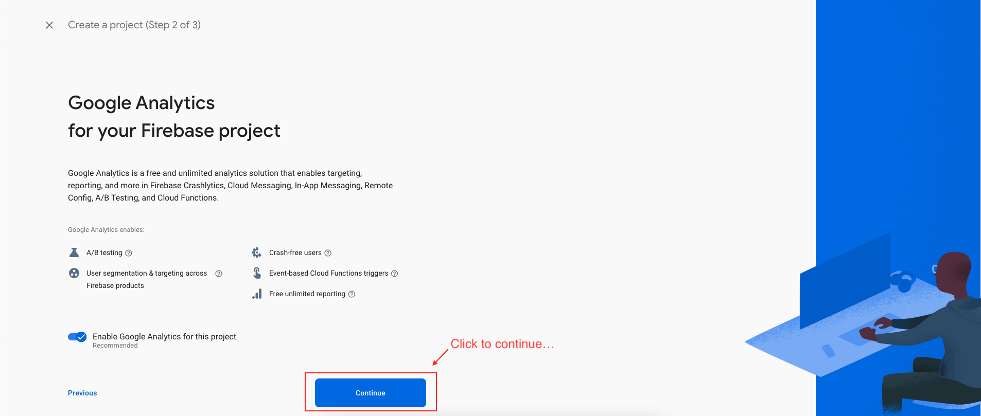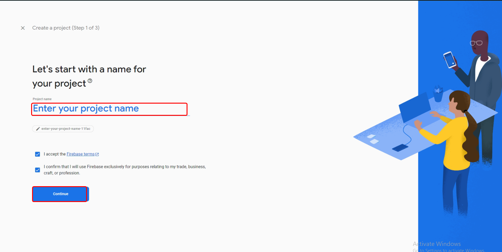 - Enter a suitable name for your project and configure your preferred options for Firebase Analytics and Google Analytics. Subsequently, click on the "Continue" button.