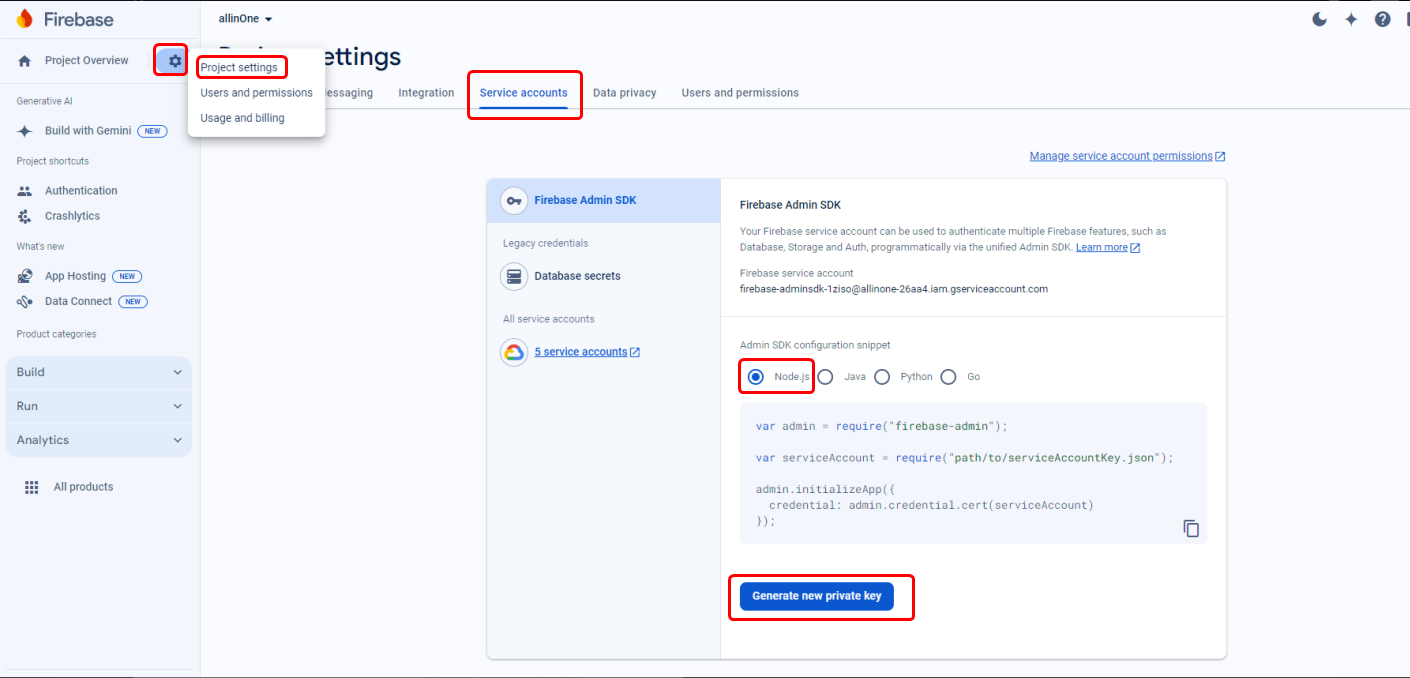 - In the project settings, navigate to the "Service Accounts" tab.